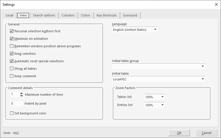 | Initial table group | Defines which table group is displayed at DBM startup. |