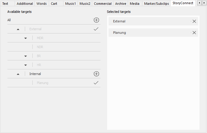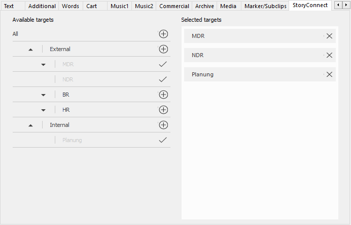 The StoryConnect tab lets you select StoryConnect distribution targets, e.g. other radio stations and/or departments across your StoryConnect network.