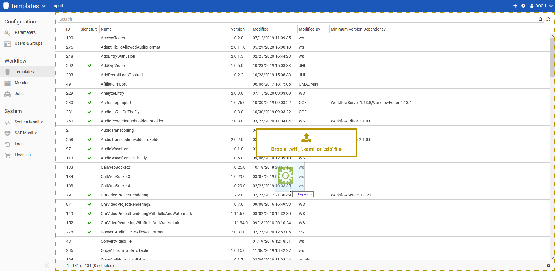 Various Workflows are required for the DPE applications to work effectively. The 'AudioWaveform' workflow template, for example, creates a waveform for every audio entry that is added to the Diga System. Workflow templates can be imported into the system in following ways: