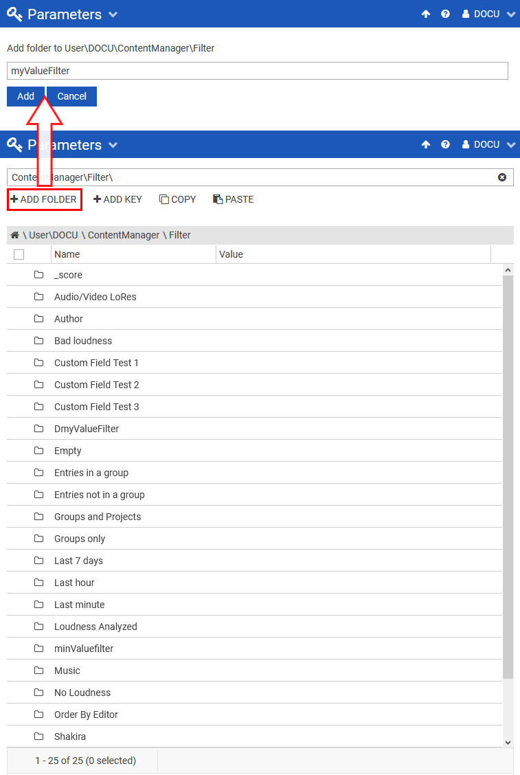 "ADD" button will generate a new folder inside the selected directory. In this example, a folder named myValueFilter is created inside |..|ContentManager|Filter|.