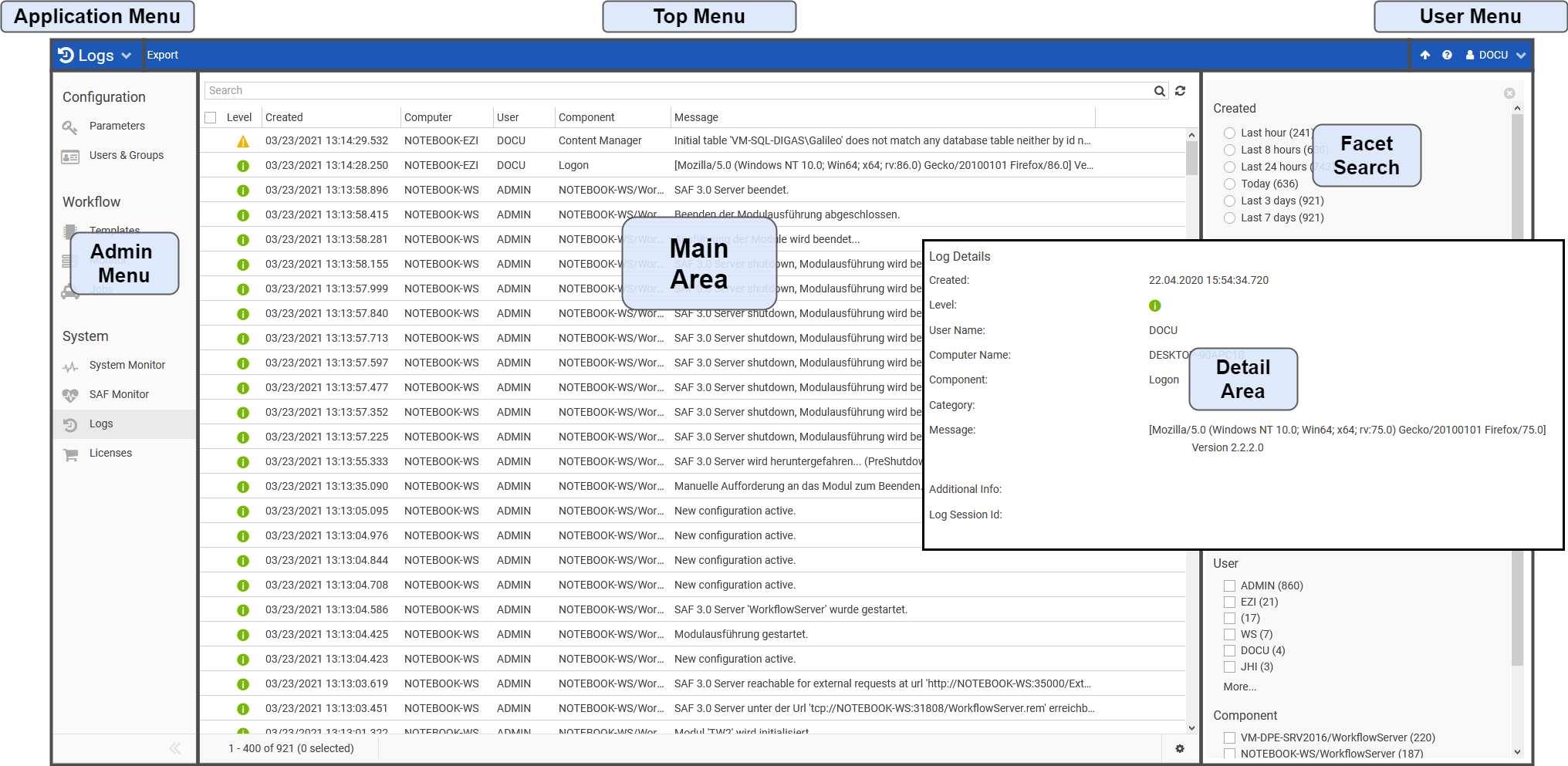 Facet Search | The Facet Search can be used to filter logs according to their created time, level, category, computer, user, and component. The number of logs fitting the current or potential search can also be seen here. |