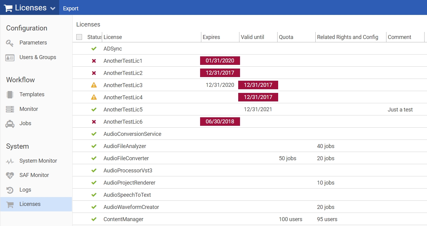 The column Status of a license informs about the availability of a license:
