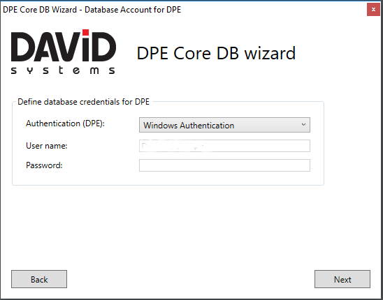 Define the user account DPE WebService will use to access the DpeCoreDb, which will be either the currently logged on Windows user or a definable SQL DB user (in that case select SQL Server Authentication in the dropdown menu). This user needs at least read/write access to the DB tables.