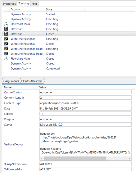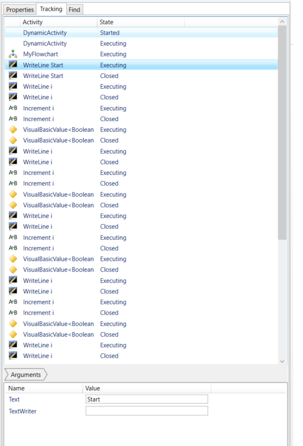 Use the property inspector on the bottom of the tracking view to see the names and values of Variables and Arguments for a tracked activity.
