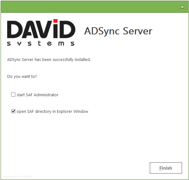The final window confirms the successful installation and offers to optionally open SAF Administration tool and/or the SAF directory in an Explorer Window. - If you Finish the installation with the option "Start SAF Administrator" it will take about a minute for SAF Administrator to start.