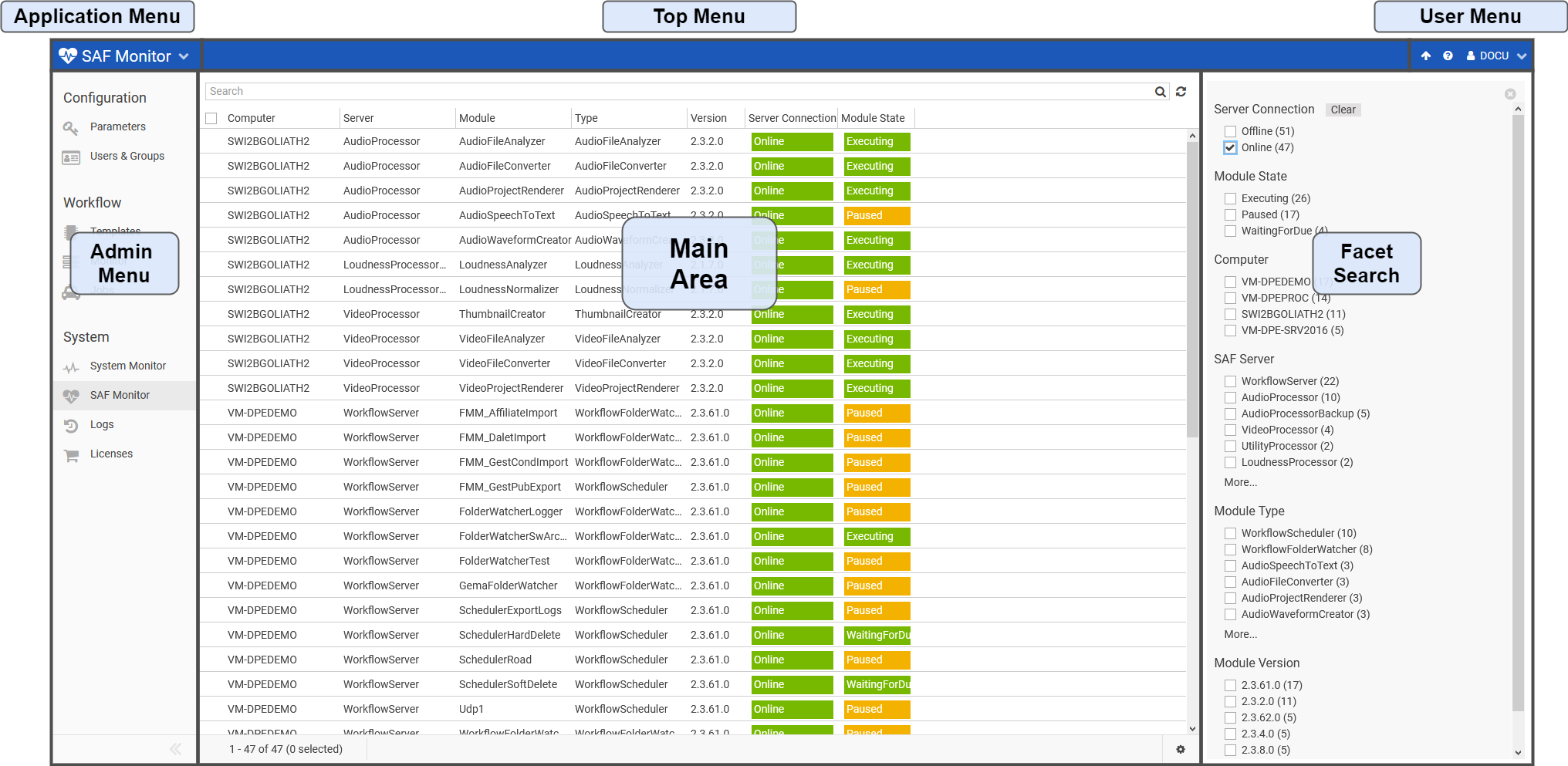 Gathering information about SAF Modules is started the first time somebody searches for modules. It will take some seconds until all servers have responded with their state. As an alternative you can start the gathering of information when DPE Server starts up, see SafServiceAutomaticStart in Configuring web.config Files.