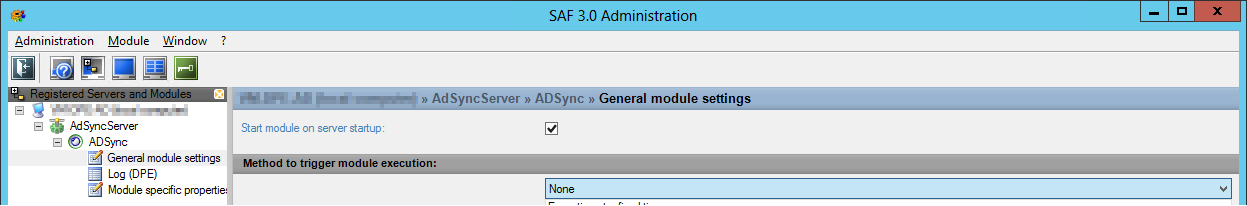 In the left panel "Registered Servers and Modules" of SAF Admin you can see the state of the ADSyncServer according to the icon, also see Introduction to SAF Administration: