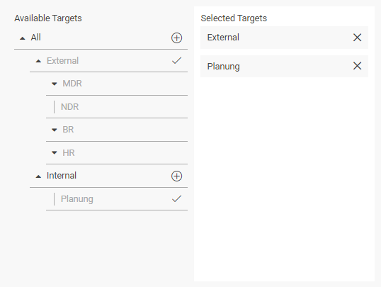 The left area of the StoryConnect tab displays targets in a hierarchical manner. Several targets have subordinate targets; in the example depicted above, "Internal" and "External" are subordinate to "All", and "MDR", "NDR", "BR", and "HR" are subordinate to "External". MDR, BR, and HR have subordinate targets (departments) which cannot be seen right now. We call subordinate targets children, and the node to which they are subordinate is called the parent.