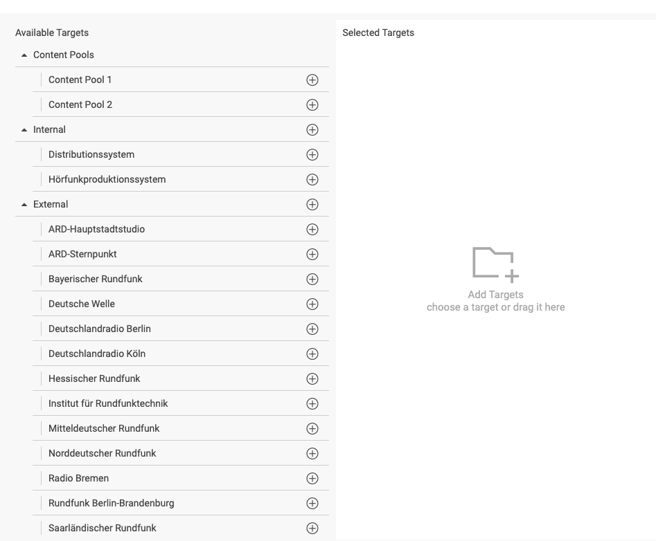 • All destinations except "all" and internal destinations can have departments attached to them. You can either select the complete destination (radio station) or some of its departments as a distribution targets.