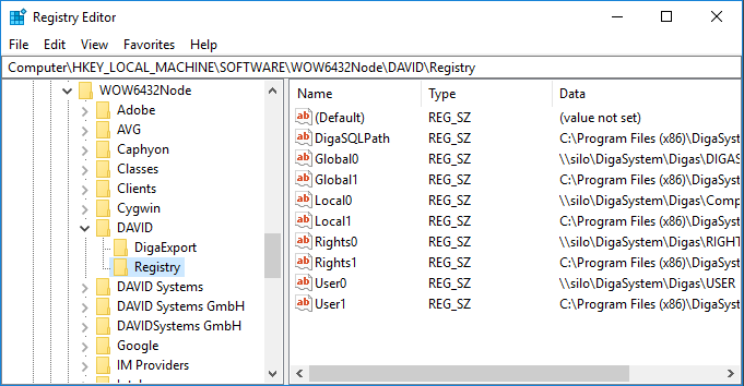 - Win XP and later (64bit): HKEY_LOCAL_MACHINE\SOFTWARE\ Wow6432Node\ DAVID\Registry