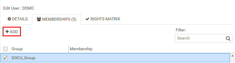 - When clicking on the "MEMBERSHIPS" tab, the list of all existing memberships (groups, if a user is being edited, or users if a group is being edited) appears. The number of current memberships is shown between parentheses.