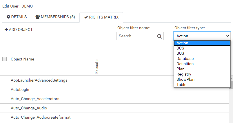 | Object filter type | Next to the object names click into a column to grant or remove the corresponding right. The rights are filtered into the following types: