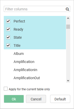 - Some application areas allow users to remember column configuration for specific use case e.g. in Content Manager, each table can have a unique column configuration which can be overwritten if "Apply for the current table only" is checked.