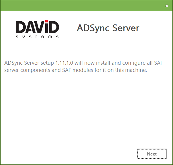 - Execute AdSyncServerSetup.exe and click Next on the Welcome screen.