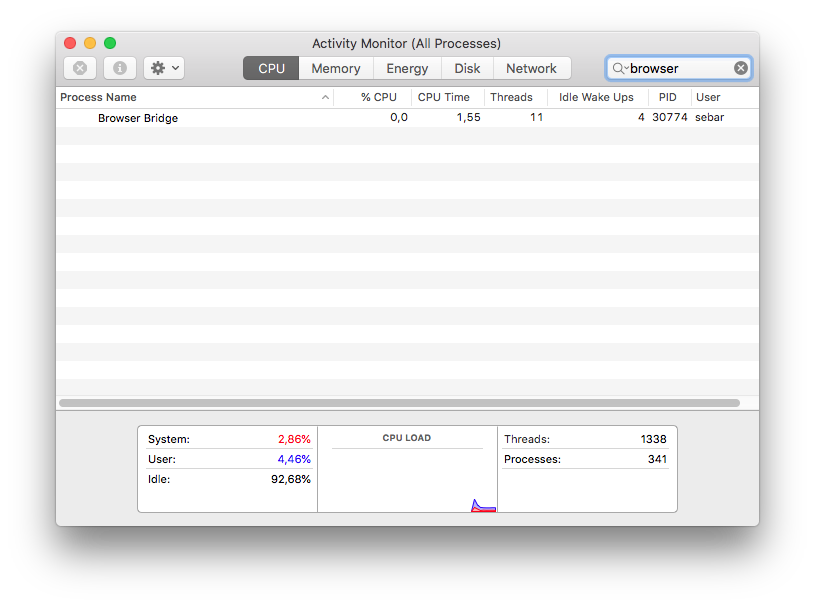 You can verify that BrowserBridge is running by opening the Mac OS Activity Monitor and search for "Browser Bridge"