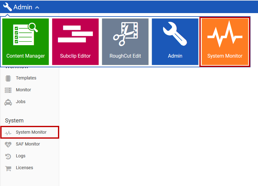 Application Menu | The Application Menu can be used to navigate between the Content Manager, Subclip Editor, RoughCut Edit, Admin and System Monitor, given that the user has sufficient rights. | |