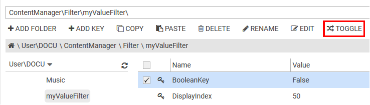 The "TOGGLE" button is available only when the user selects a single boolean key