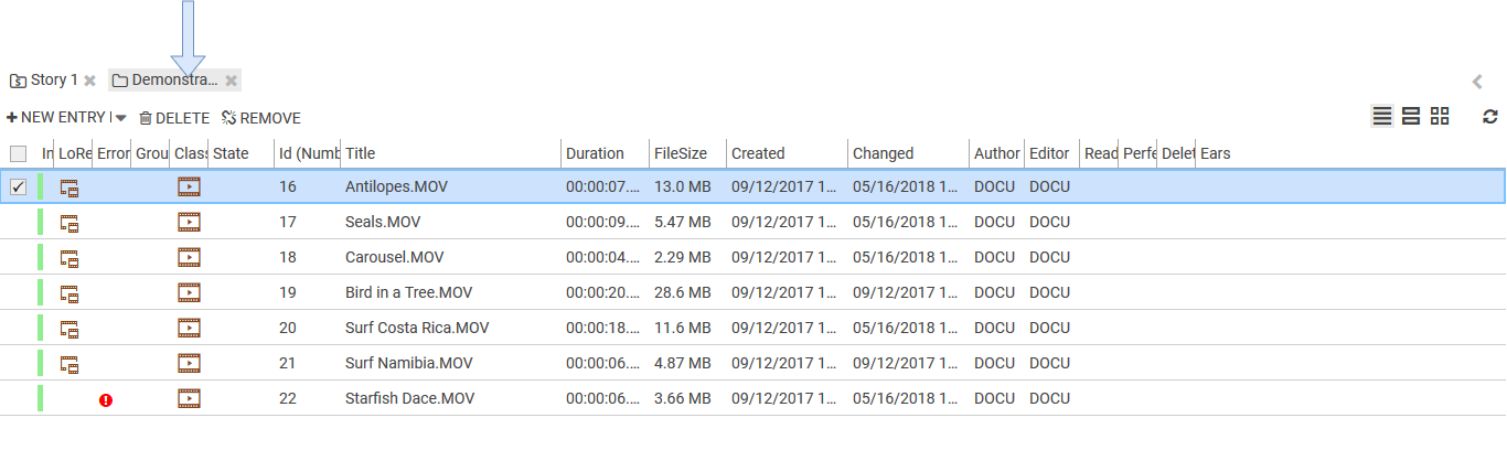 - Select which entries you want to open (e.g. to select all entries of a story/group, click on the square in the first column as shown in the screenshot below)