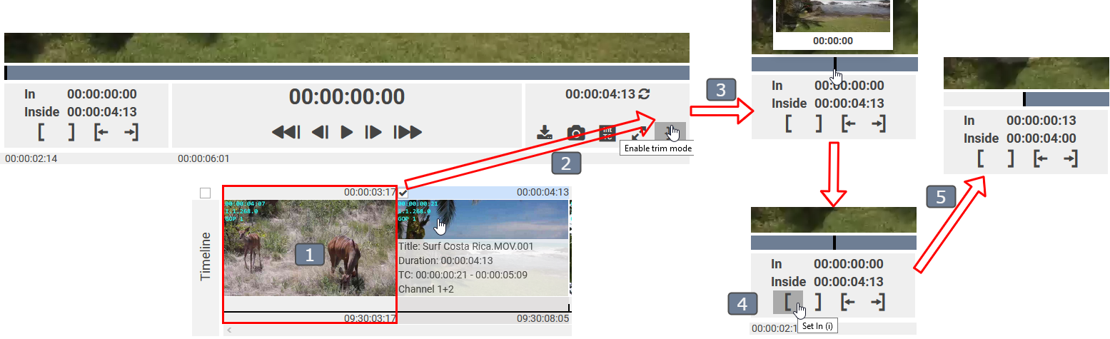 - Change to the trim mode. In trim mode, the entire original video entry is loaded into the preview player with the segment highlighted. In normal mode, only the segment is loaded into the preview player.