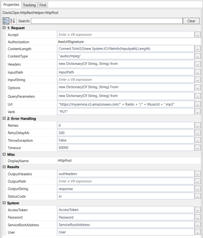 Set Authorization to "Dpe" and the HttpPost activity will automatically geneate a Dpe-Auth token from User and Password. You don't have to set any manually calculated authorization headers.