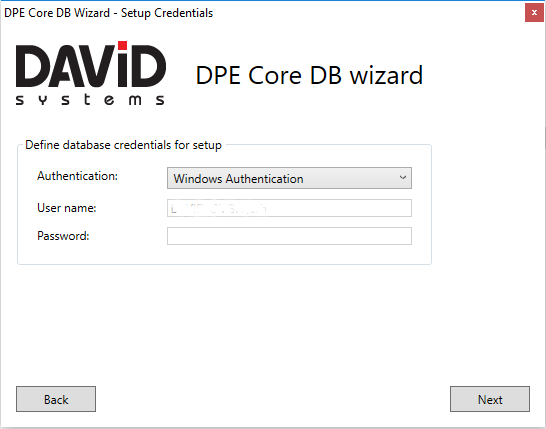 Define the user account DPE WebService will use to access the DpeCoreDb, which will be either the currently logged on Windows user or a definable SQL DB user (in that case select SQL Server Authentication in the dropdown menu). This user needs at least read/write access to the DB tables.