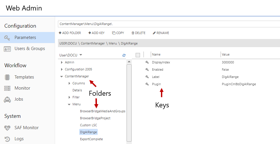 Parameters are used to customize the Diga system. Parameters are made of individual keys (settings), which are located in a logical folder structure (see Web Admin below). This section gives an overview of the notation used to navigate in this parameter tree. Note that the Admin.exe uses a different notation, please see the Warning section below.