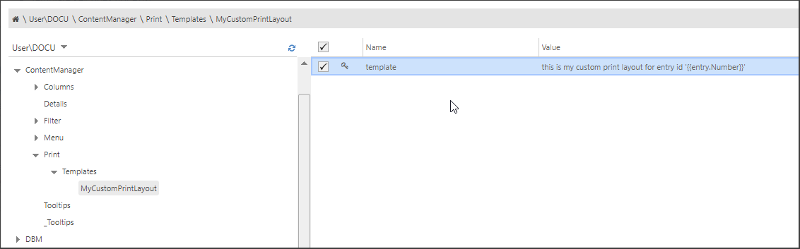 Config key species the template with which the selected entry/entries will be printed.