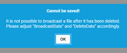 Background consistency checks make sure that changes made to the metadata are logical. These ensure, for example, that the DeleteDate is after the BroadcastDate. If this is not the case, a dialogue appears. Similar checks are executed when applying a new DeleteDate or BroadcastDate in a bulk operation to multiple entries.