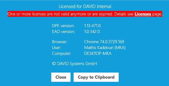 Under About DPE the user can view and copy support information. He can also view the state of his license, if the license is no longer valid or expired, a red message appears with a link to the licenses page: