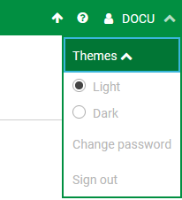 Clicking on the user will open a user menu with option to select UI schemes, "Change password" and "Sign out".