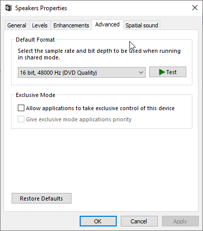 Switch off option "Allow applications to take exclusive control of this device".