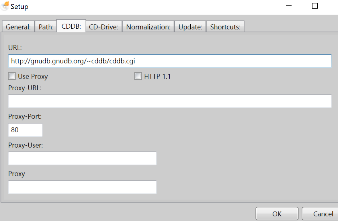 CDDB Server must be a valid address for a CD DataBase server. (Note: since 2020, CDDB and FREEDB are no longer accessible!) The only known working CD Database server for the general public we are aware of is GNUDB. Therefore we suggest entering the address http://gnudb.gnudb.org/~cddb/cddb.cgi and set the port to 80.