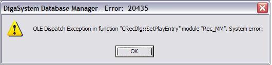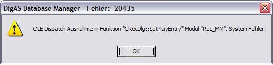 Problem: If I want to open one Database entry, I get the Error Message -20435: (English Message) OLE Dispatch Exception in funktion "CRecDLG::SetPlayEntry" module "Rec_MM". System error