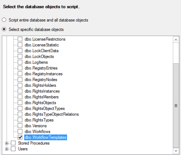 | 3 | "Select specific database objects", e.g. "dbo.WorkflowTemplates"