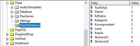 To add your own, custom DEFINITION lists, create a new subkey first: Global|Digas|UserDefinitions. Here you can create additional DEFINITION lists.