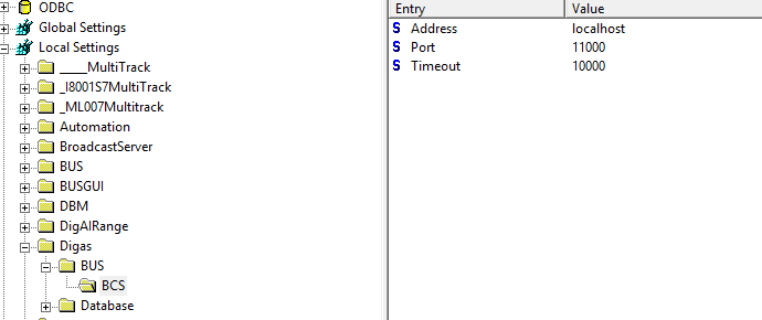 - You first need to configure the available BUS instances in the DigaSystem registry. Use the key “Digas\BUS” to create sub keys, one for each instance. The name of the sub key is the name as it is displayed to the user. Possible parameters are: Address, Port, TLSPort and Timeout. For more information, see the parameter description in DigParam.rtf.