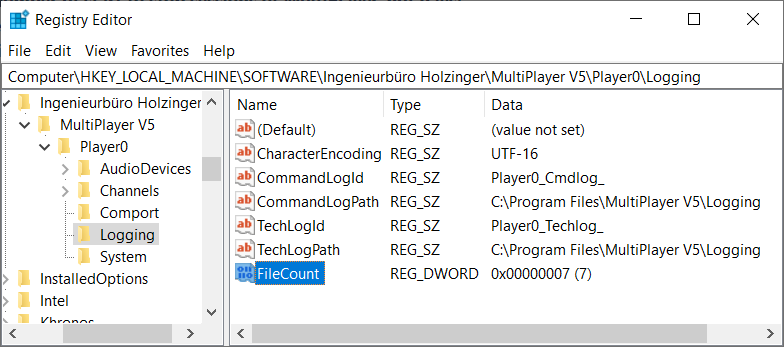 Computer\HKEY_LOCAL_MACHINE\SOFTWARE\Ingenieurbüro Holzinger\MultiPlayer V5\Player0\Logging\FileCount=[n]