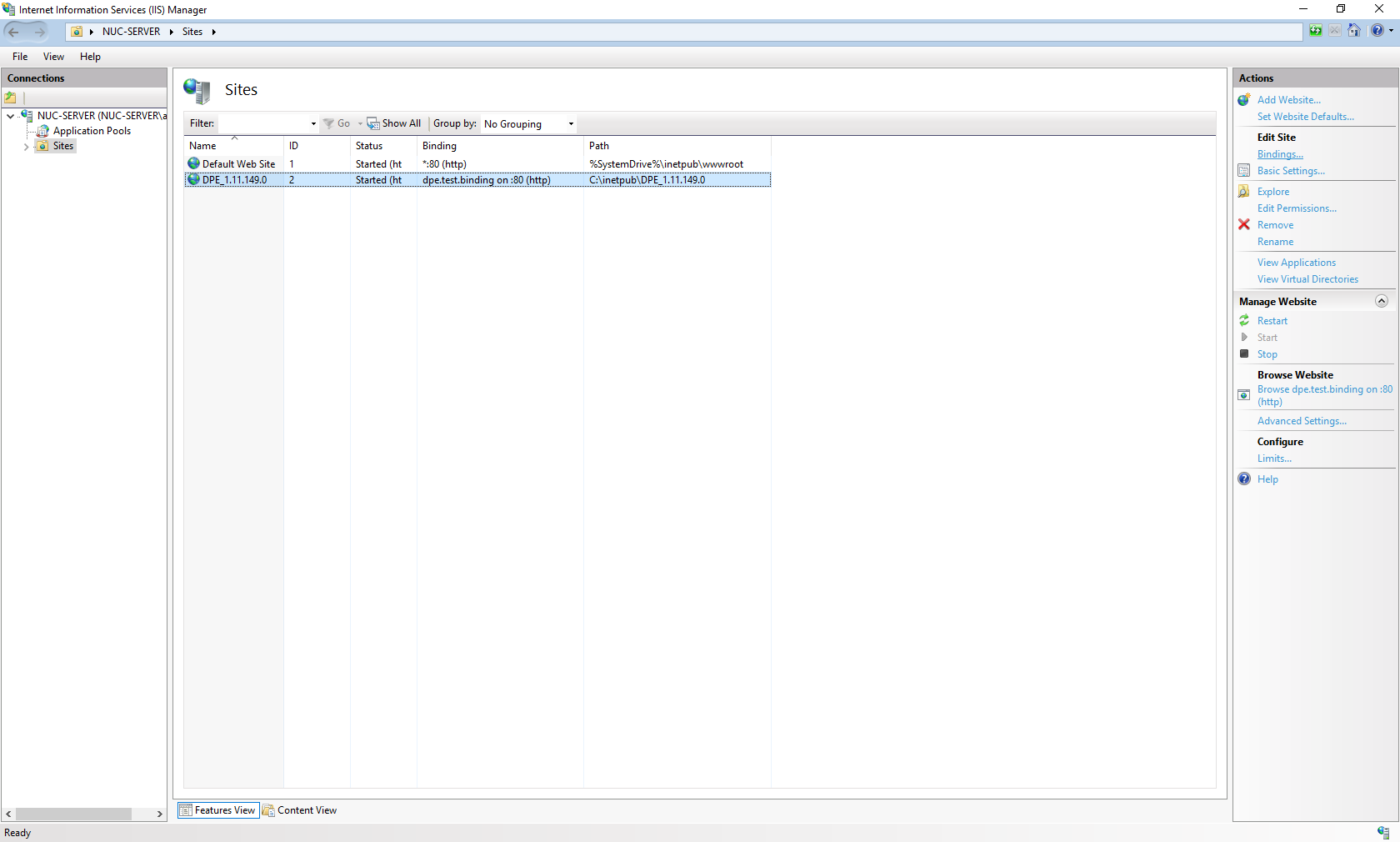 Other options are to set a different port for DPE, which is inadvisable as it will be harder to keep organized, or just just shifting the default site bindings to DPE and deleting that site.
