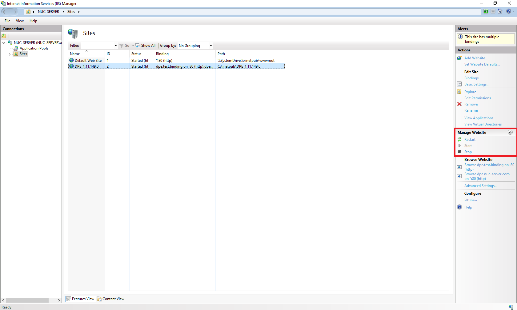 - Verify that the site is running in Manage Website.