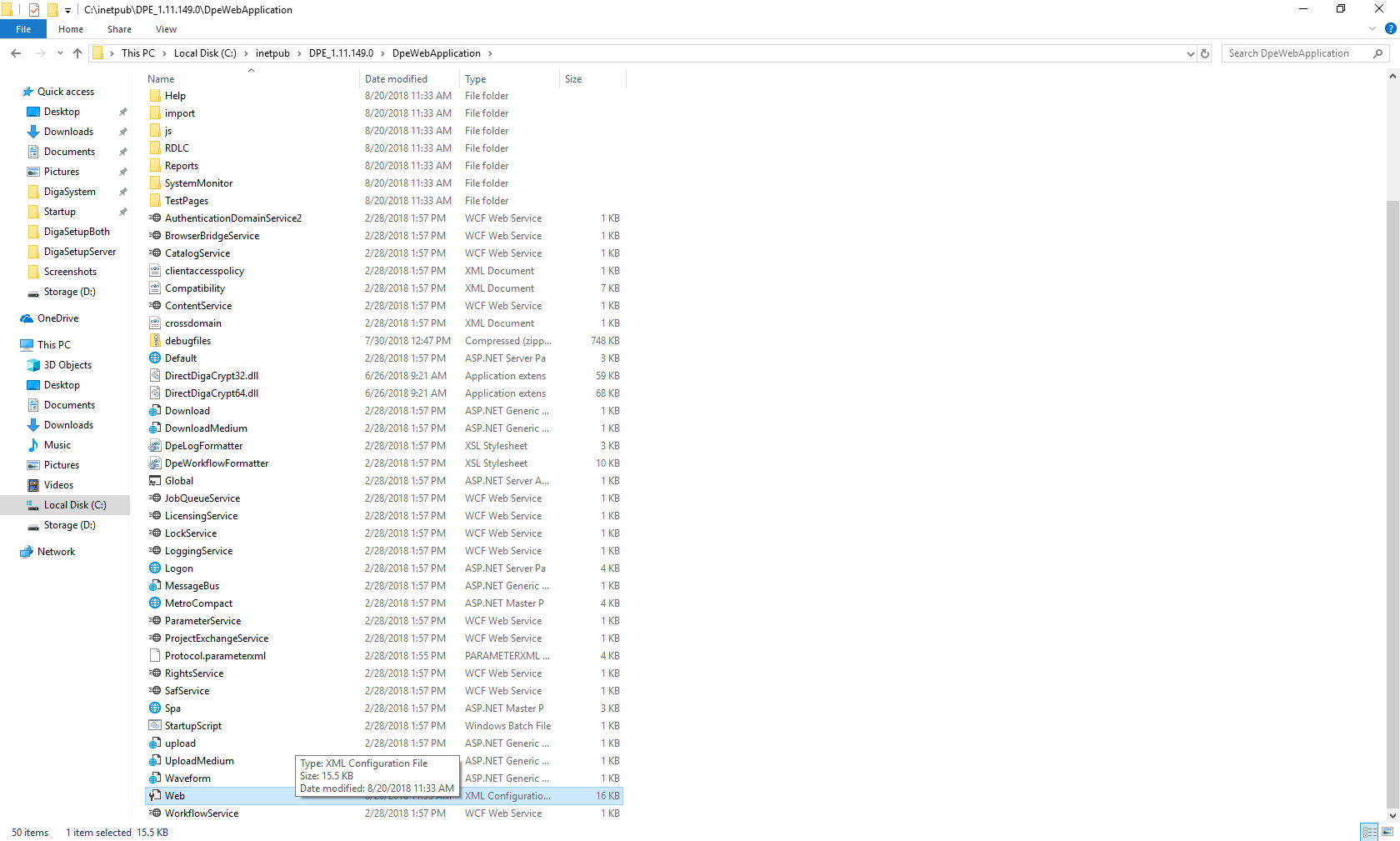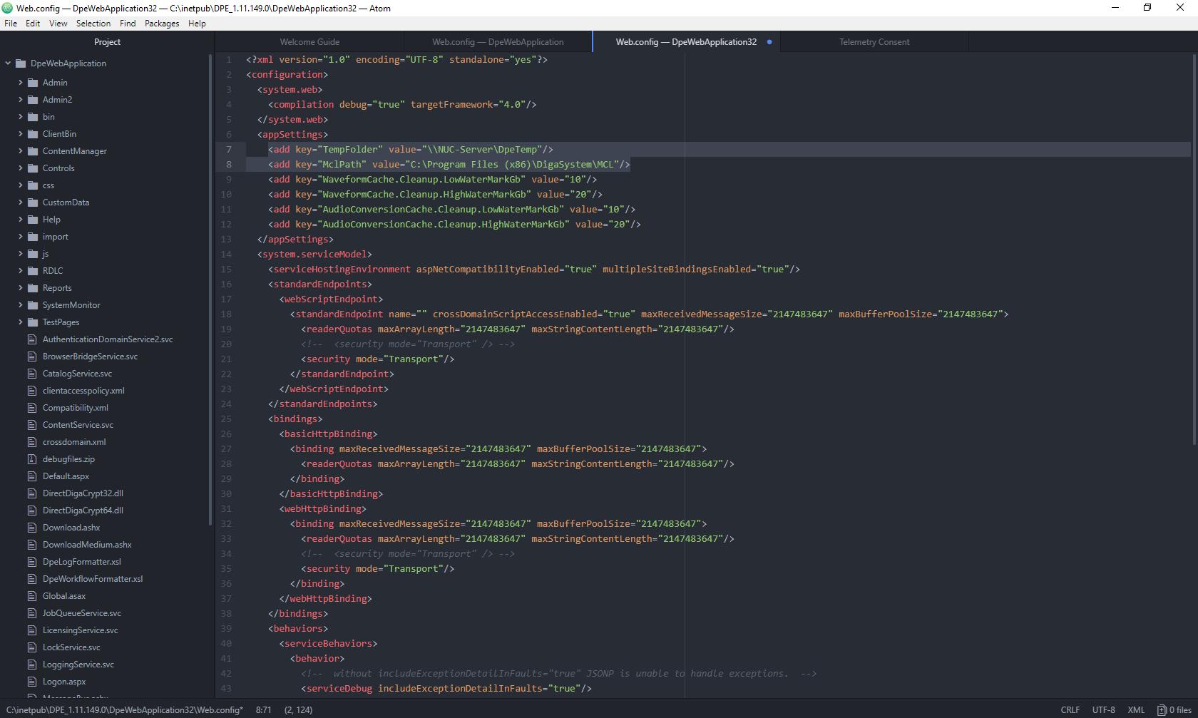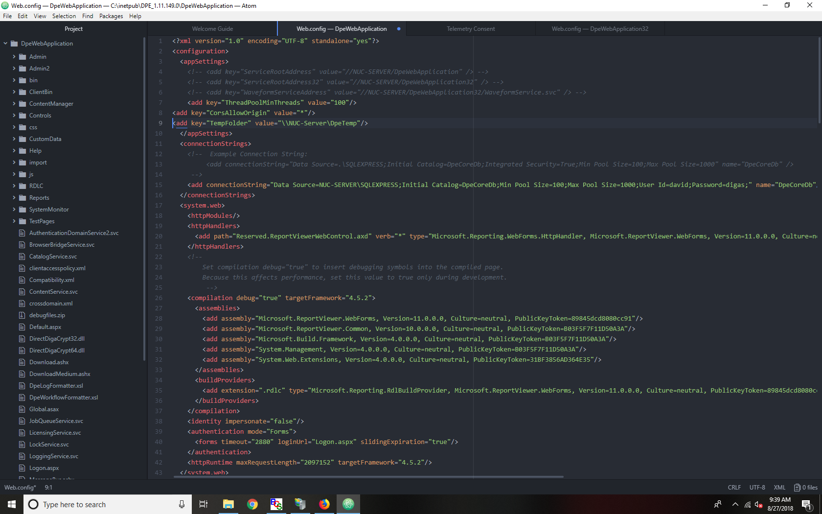 - Navigate to $path\DPE_$version\DpeWebApplication and open the Web configuration file with the text editor of your choosing (this tutorial is using Atom). It will need to be executed as an administrator, or there will not be any write permissions.