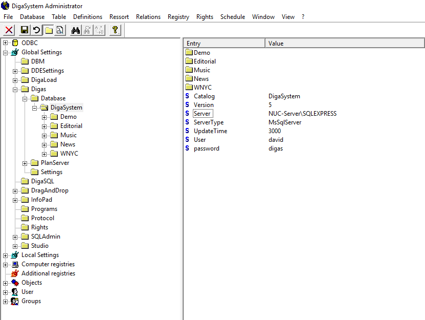 - Add the keys displayed (Catalog, Version, Server, ServerType, UpdateTime, User, and Password) into Global | Digas | Database | DigaSystem (or whatever it is called). Adapt the values to your installation. If a file DSN is used,