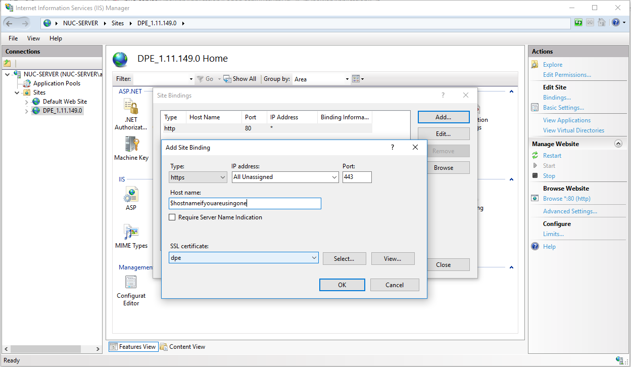 - Open IIS and select the DPE site, then select 'Bindings' (on the right side menu).