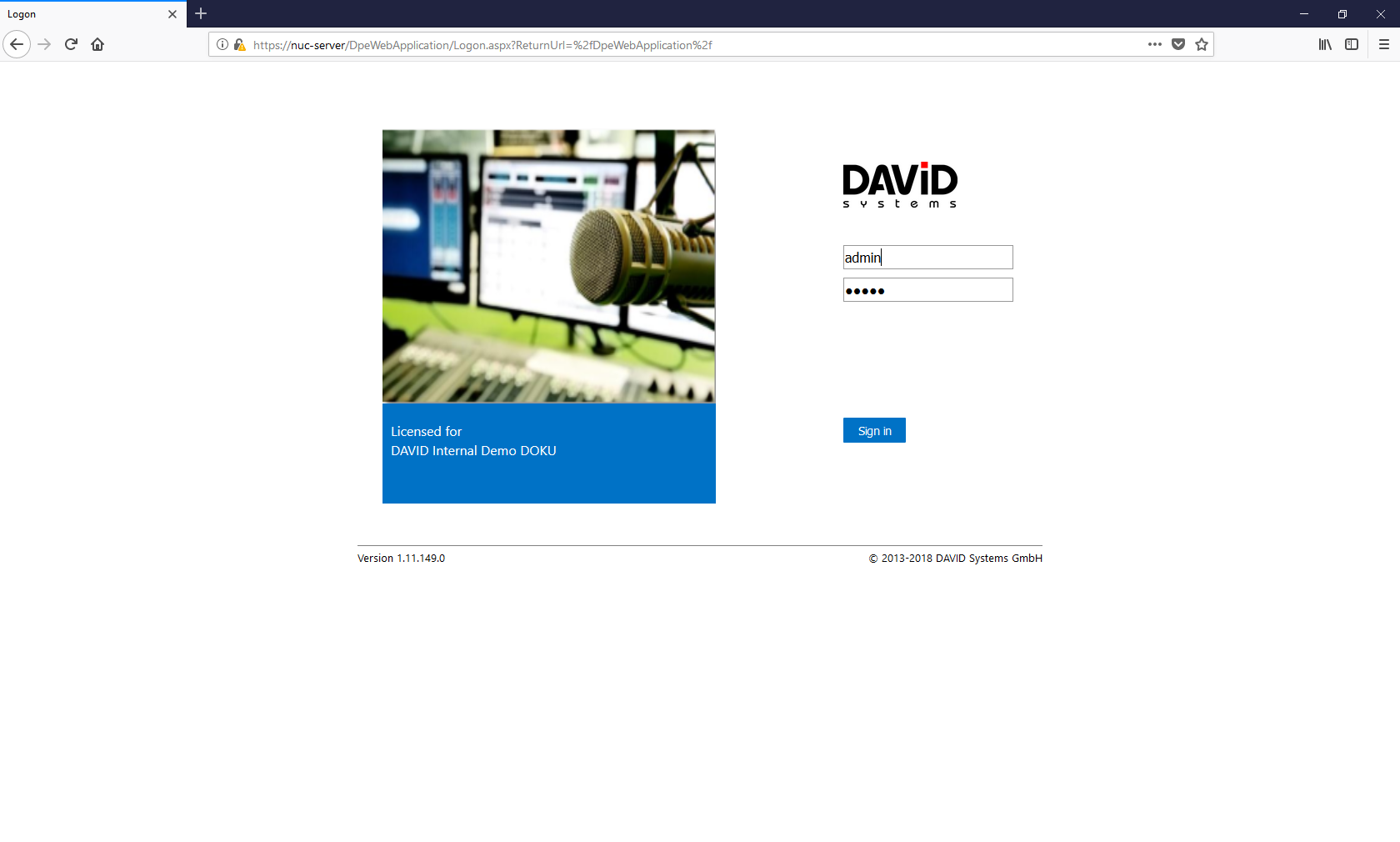 - Navigate to the DPE web portal, according to the bindings set during installation, and sign in.
