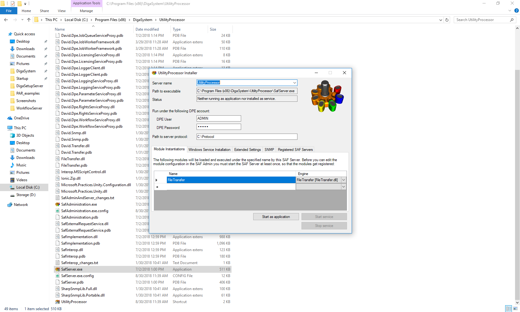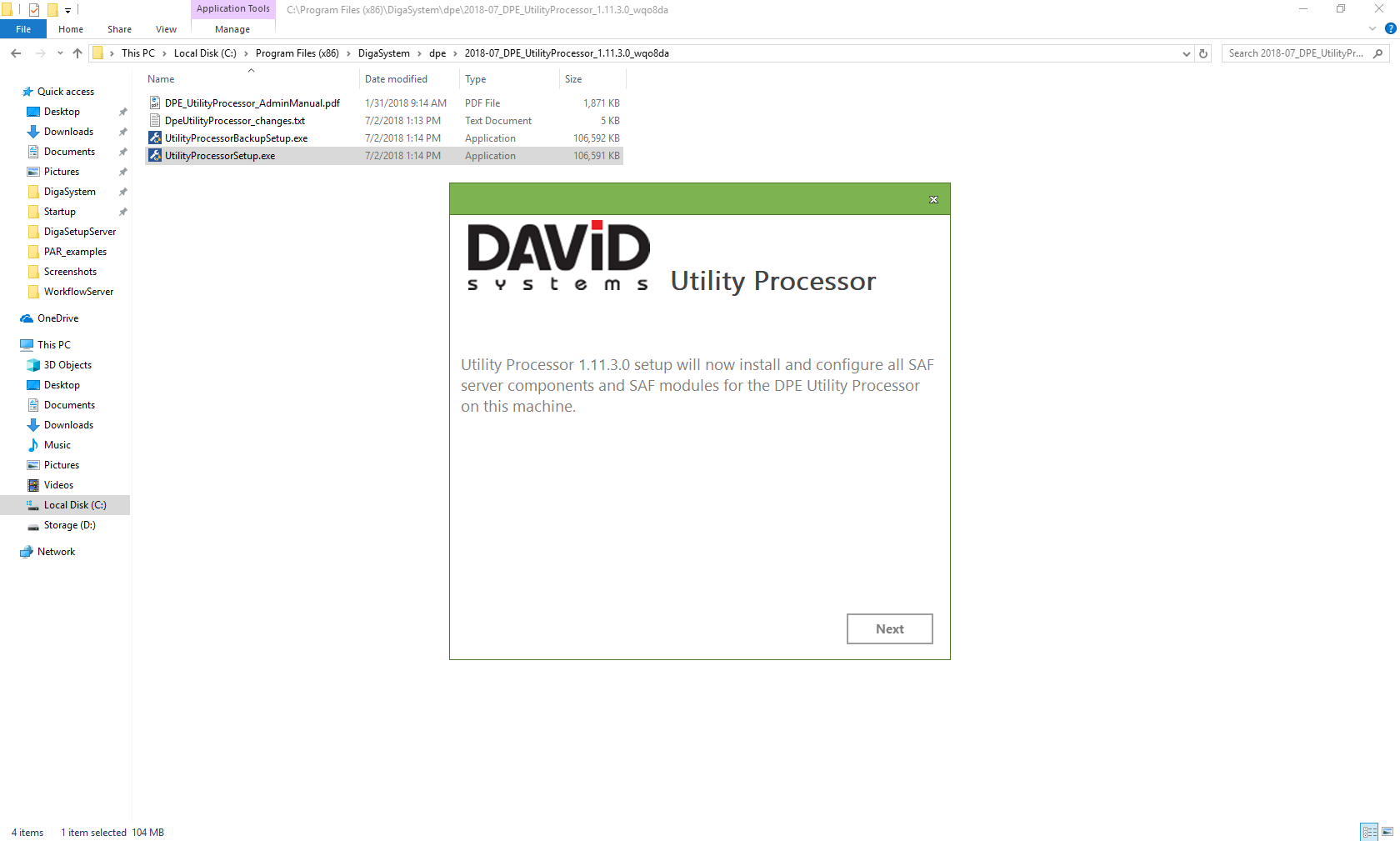 - As an example of how a DPE Module installation will look, we will be using Utility Processor. Navigate to the directory that the setup executable is located in, and run it; you will be presented with this window.