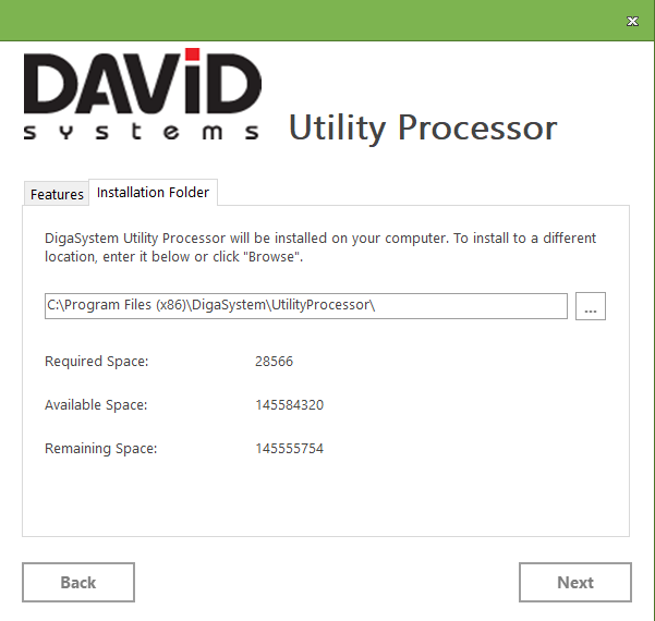 - The location to which everything will be installed is specified in the 'Installation Folder' tab. It will default to the Digas directory.
