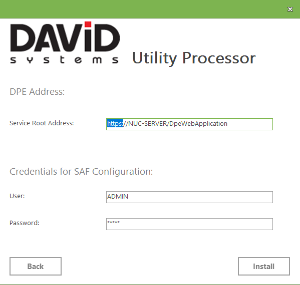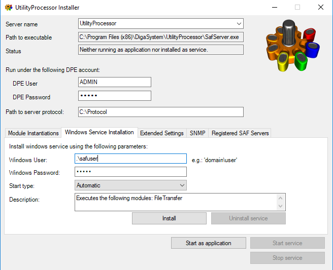 - Go to the 'Windows Service Installation' tab. Put in .\safuser, or whatever account is to be operating SAF, and its password. Click 'Install'.