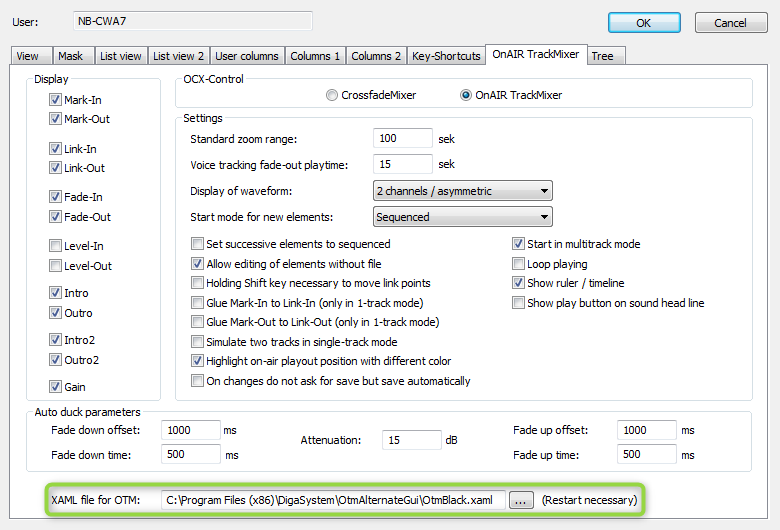 The folder “OtmAlternateGui” of the OnAir TrackMixer software package contains several files of the type .XAML to change OTM’s appearance. In order to do so in the Settings use the Browsing button of the field “XAML file for OTM” to load such a “skin”.