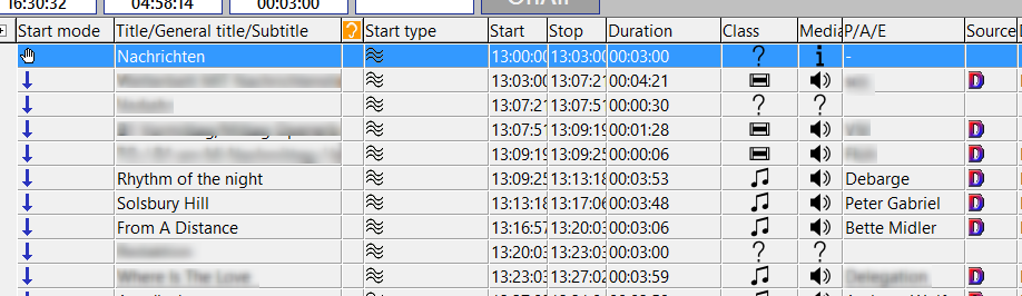 When you press a "volume up/down" key of a music or drop item that is not yet started, the duck level of this element is adjusted. When you press the respective "Start element ducked, duck/unduck running element" key, the music or drop element is played at the level you have set. This level is indicated in the track next to the "mark in" of the music or drop element.