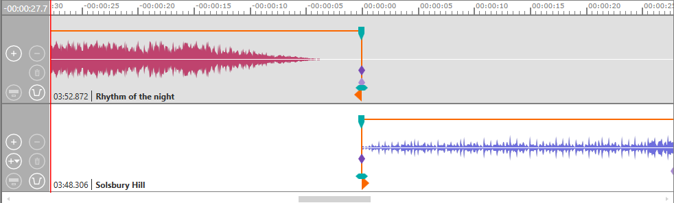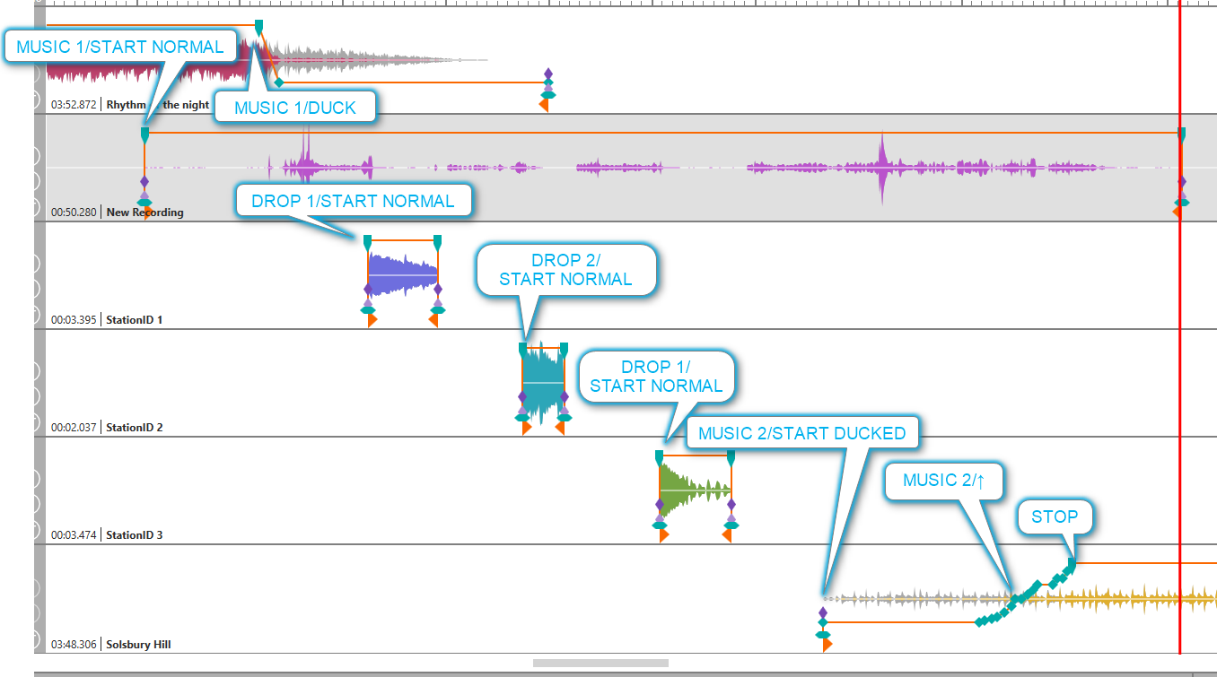 To insert the "StationID 1" jingle, press "DROP 1/START NORMAL/FADE OUT" (or "DROP 1/START DUCKED/DUCK/UNDUCK" if you want to have reduced volume). This makes "StationID 1" jump left to the current sound head position. "Rhythm of the night" continues to play, but you can use the "MUSIC 1/START NORMAL/FADE OUT" to fade out the music at any time.