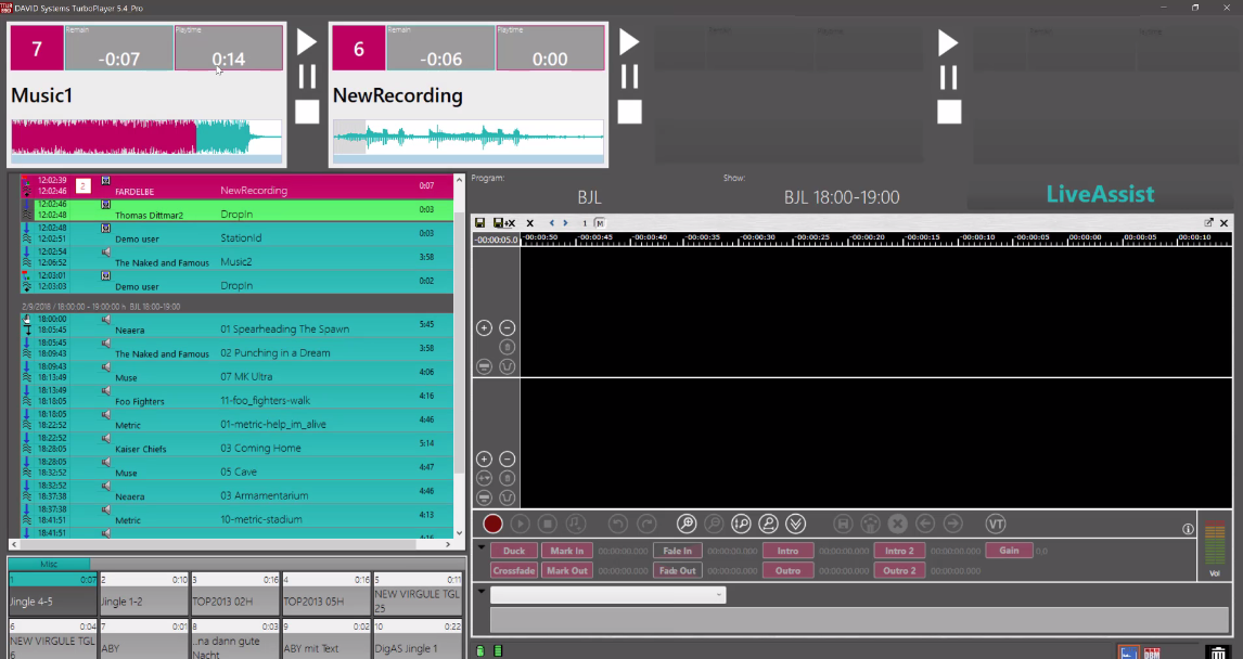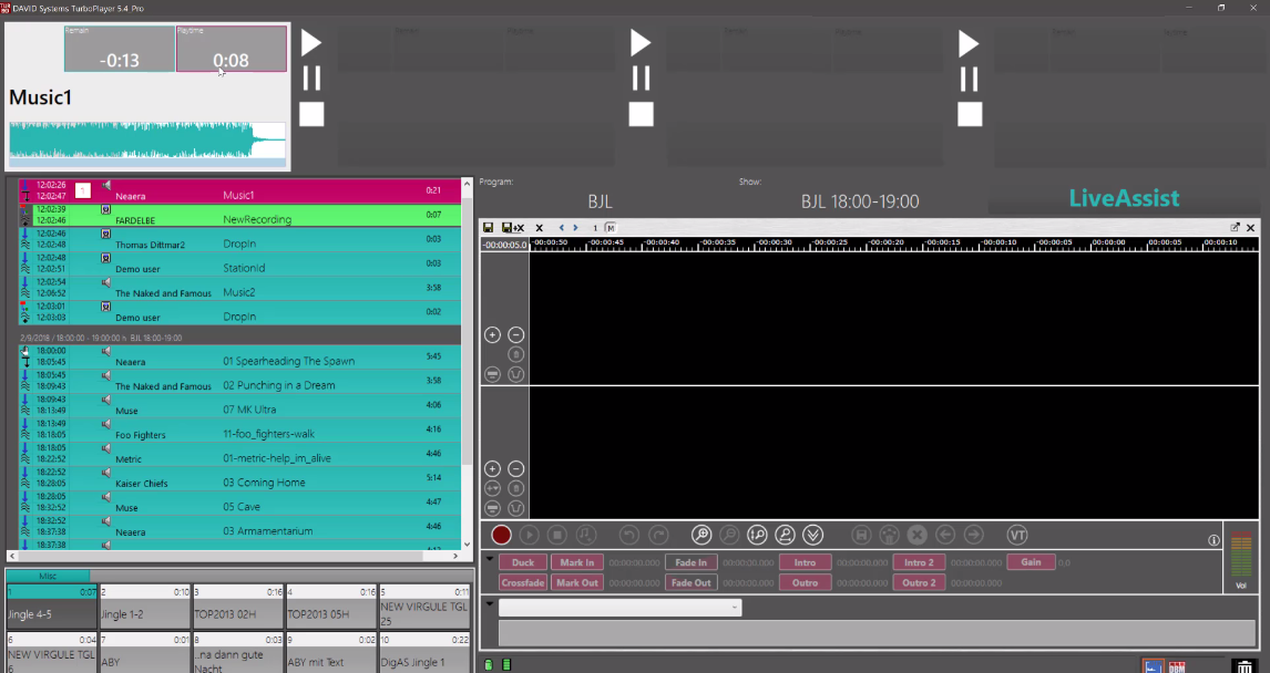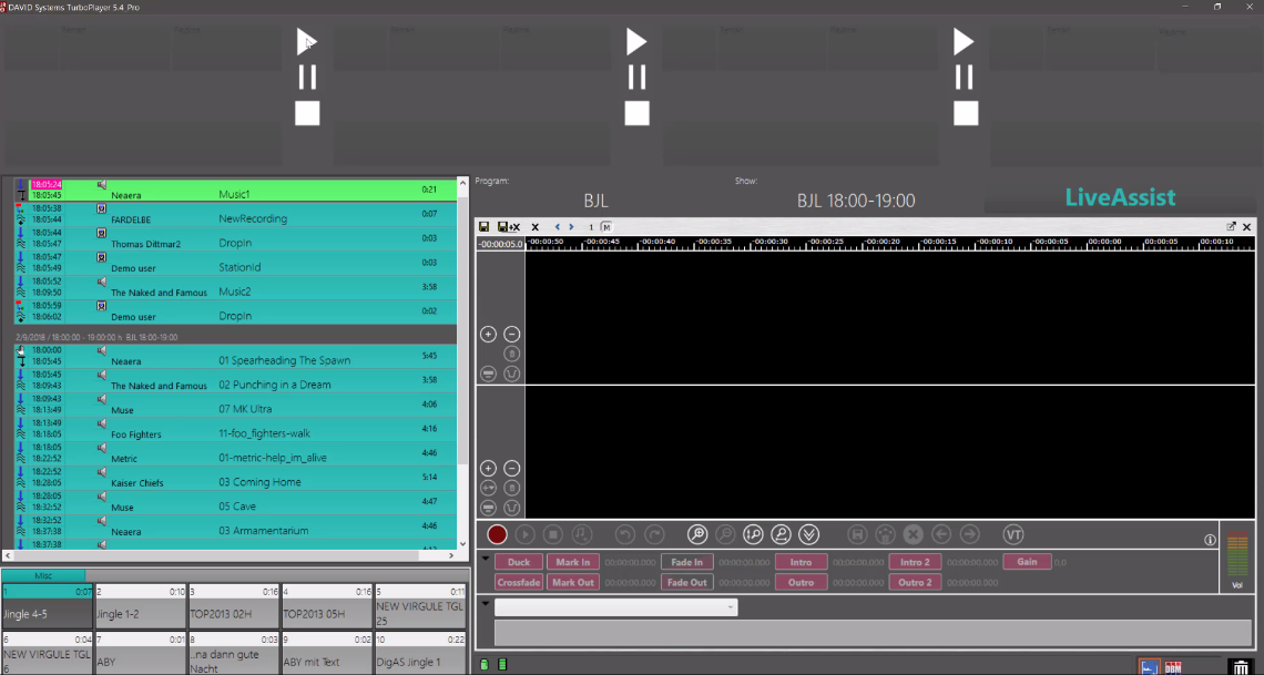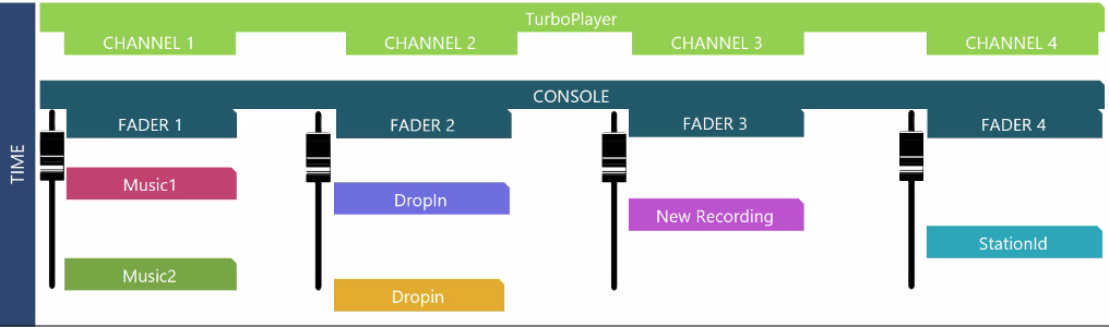 Let us take a look at that in TurboPlayer. Each of the four players on top of the TurboPlayer represents a fader on the console. So If you start the transition now, each element will be played on a free available channel therefore on a free available fader.